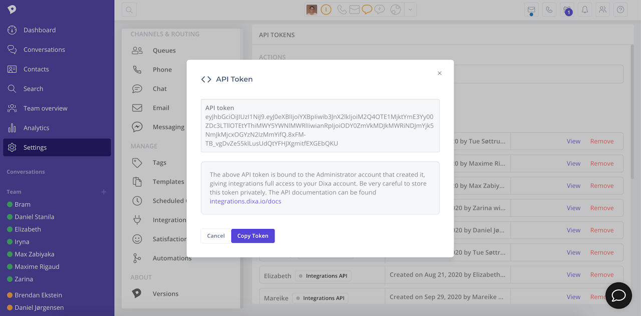 Det eneste du skal gøre er, at oprette et API Token i Dixa, og sende dette til din Customer Success manager hos Capturi. Så står vi for resten.
