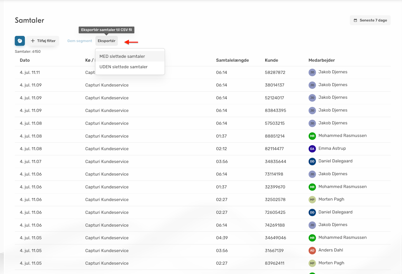 Når du analyserer og lytter til samtaler i Capturi, kan det være at du gerne vil bruge de samtaler du finder i forbindelse andre arbejdsopgaver i din organisation. Derfor giver vi dig mulighed for at hente samtalerne ned i CSV-format, så at du kan flytte data du finder i Capturi til andre systemer.