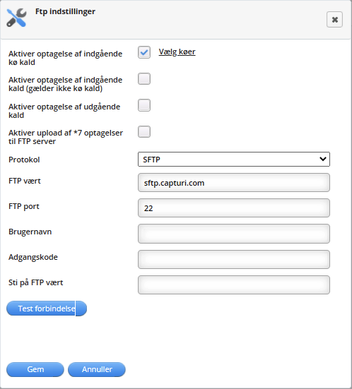 Hvis ikke du/I selv har en FTP server, er det muligt, at få den hosted af Capturi, hvilket jeres customer succes manager kan hjælpe med arrangere.