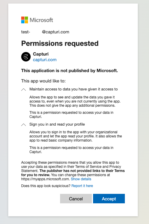 Before you can do that, Capturi needs to be granted access to the requested permissions.
