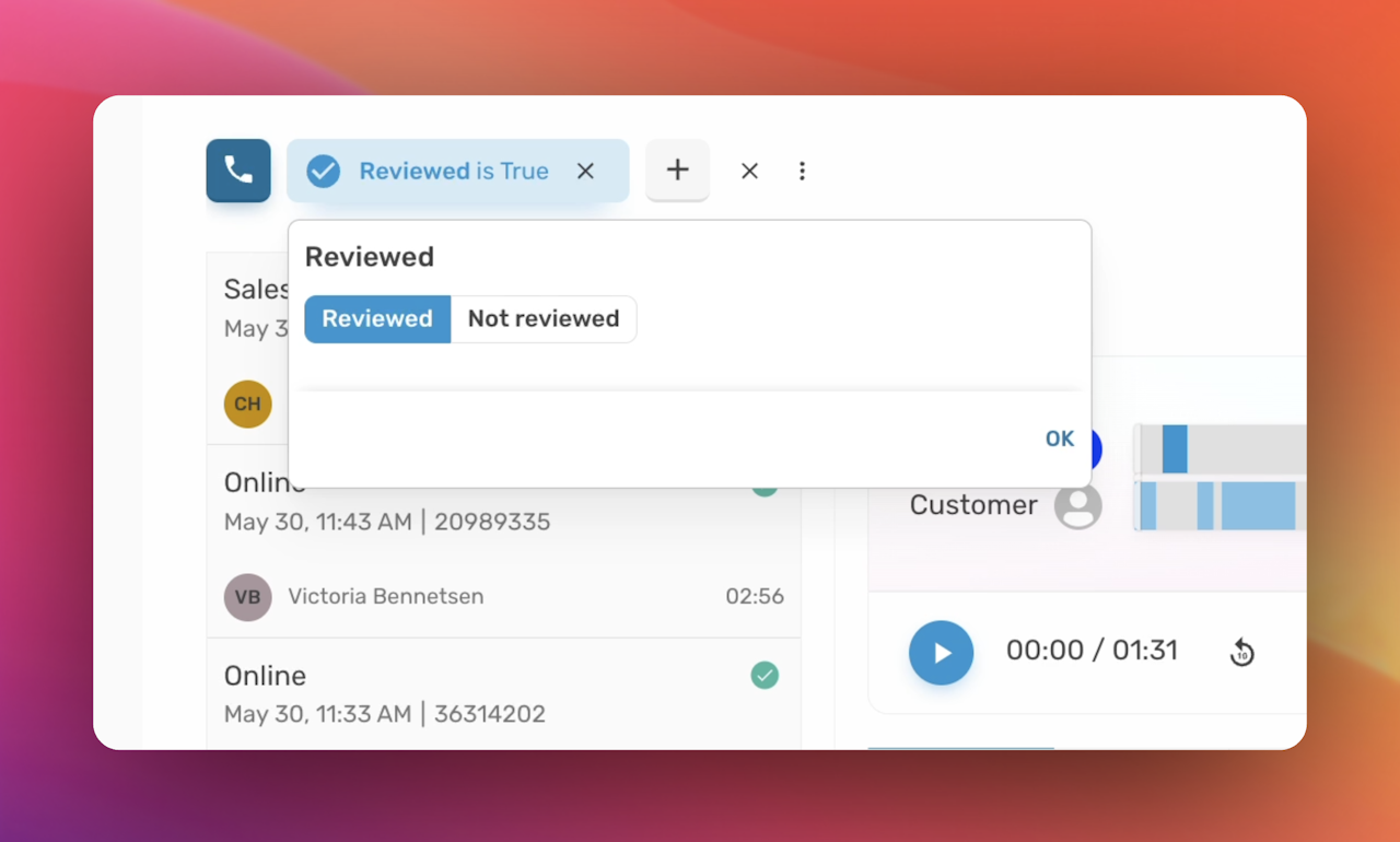 Combined with other filters like "employee", "label" or "duration", it makes it super easy to find conversations relevant for review, or those that have already been reviewed.Speaker*