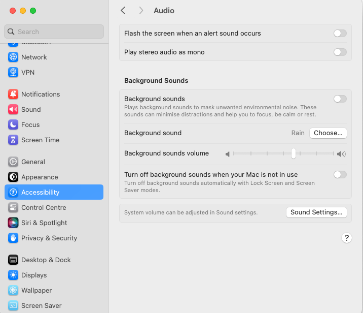 Select the Start button, then select Settings > Accessibility > Audio, and then switch on the Mono audio toggle.